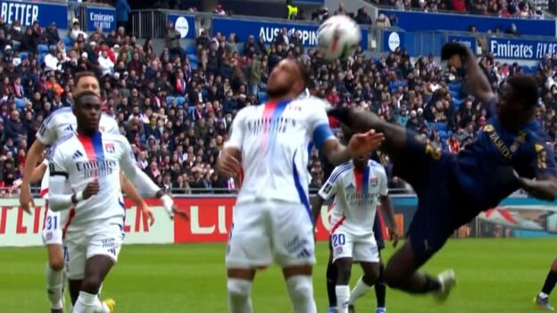 En tentant un ciseau dans la surface lyonnaise en début de match, l’attaquant rémois Oumar Diakité a directement heurté avec son pied l’arrière de la tête de Corentin Tolisso.