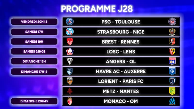 La 28e journée de Ligue 1, qui s’ouvre ce vendredi soir avec PSG-Toulouse (20h45), verra notamment un derby du Nord entre Lille et Lens samedi (21h05) et un choc Monaco-OM dimanche (20h45). Dernières infos, conférences de presse… suivez en live toute l’actualité du championnat avant cette 28e journée.